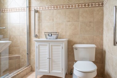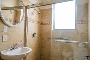 There are two bedrooms, each with a queen sized bed, located directly off the main living area and separated from each other with sliding barn doors. We also provide a vanity with LED lighting in the master bedroom. There is a smart TV located in each bedroom, and you’ll find a large closet in the second bedroom.